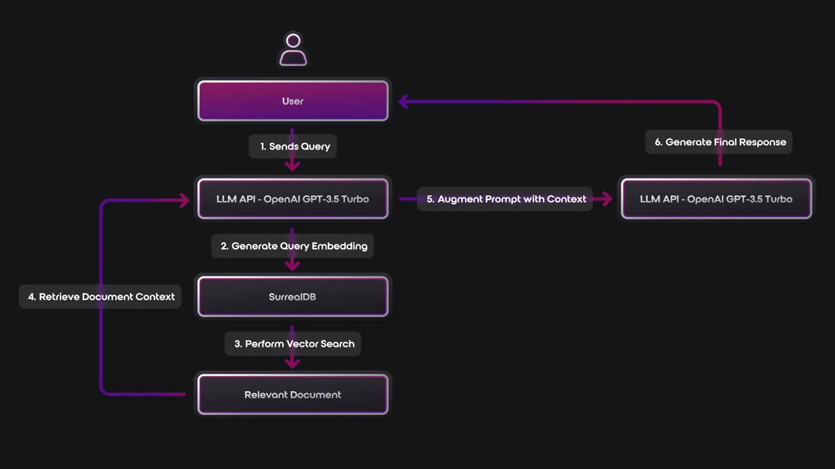 SurrealDB Vector Search: The query embedding is sent to SurrealDB, where a vector search is performed to identify the most relevant document stored in the database.