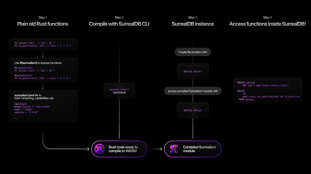 Surrealism is a new open-source extension framework for SurrealDB. It allows you to define modular, programmable logic using functions you write in Rust - and execute them directly within the database at runtime. We intend to expand Surrealism to support other languages including JavaScript and Python.