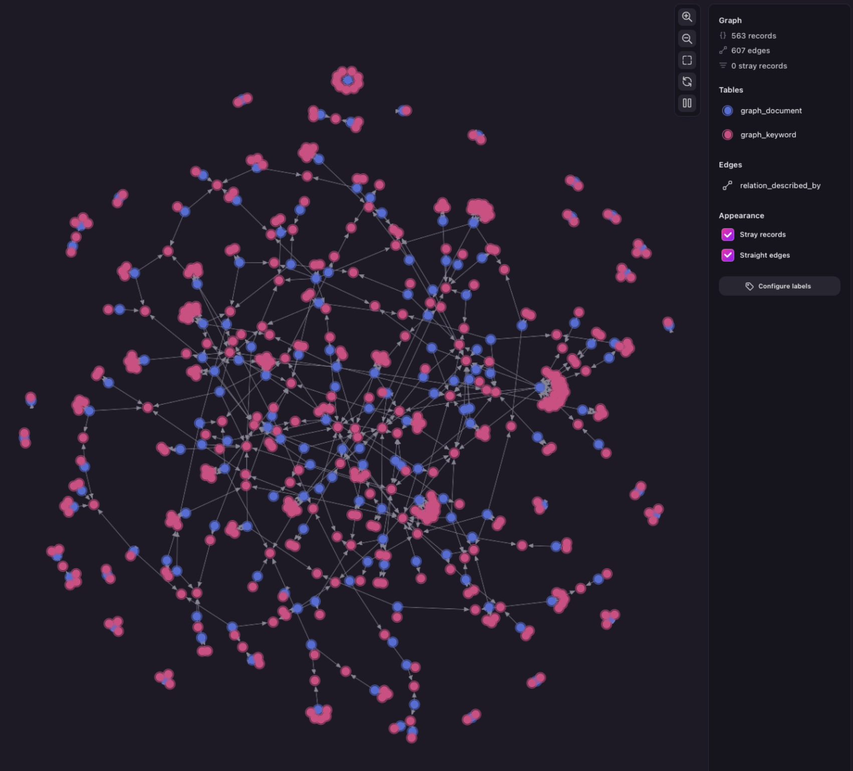 To visualize how the document -> keyword graph looks like, run the following query using Surrealist: