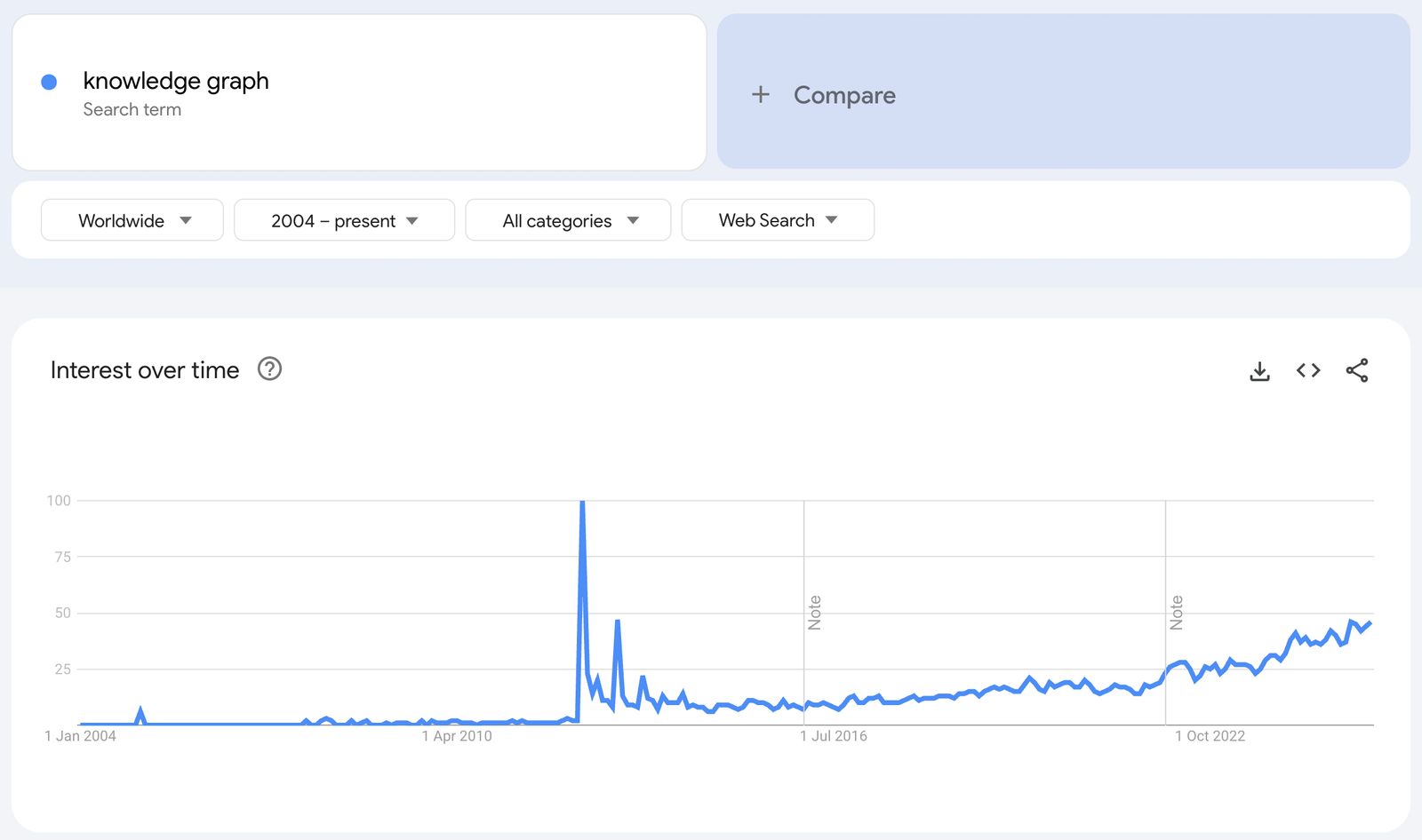Searches for “knowledge graphs” searches over time. Notice the spikes in 2012 (Google’s blog) and November 2022 (ChatGPT release).