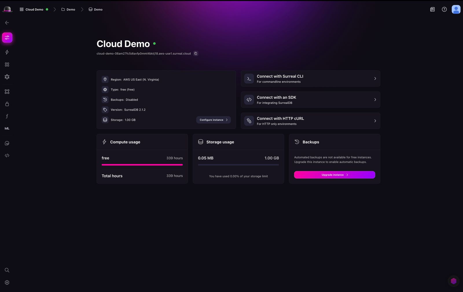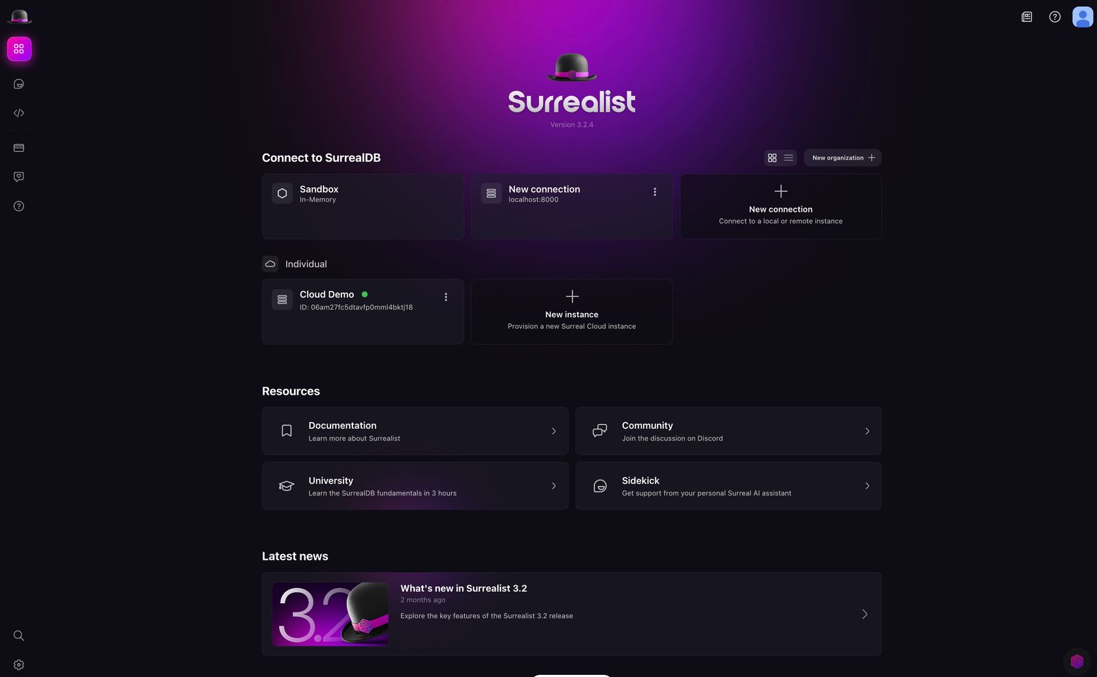 To ensure that you have a better experience when using Surreal Cloud, we have introduced a new overview page. This page provides a more intuitive and user-friendly experience for navigating between local connections and Surreal Cloud Instances.