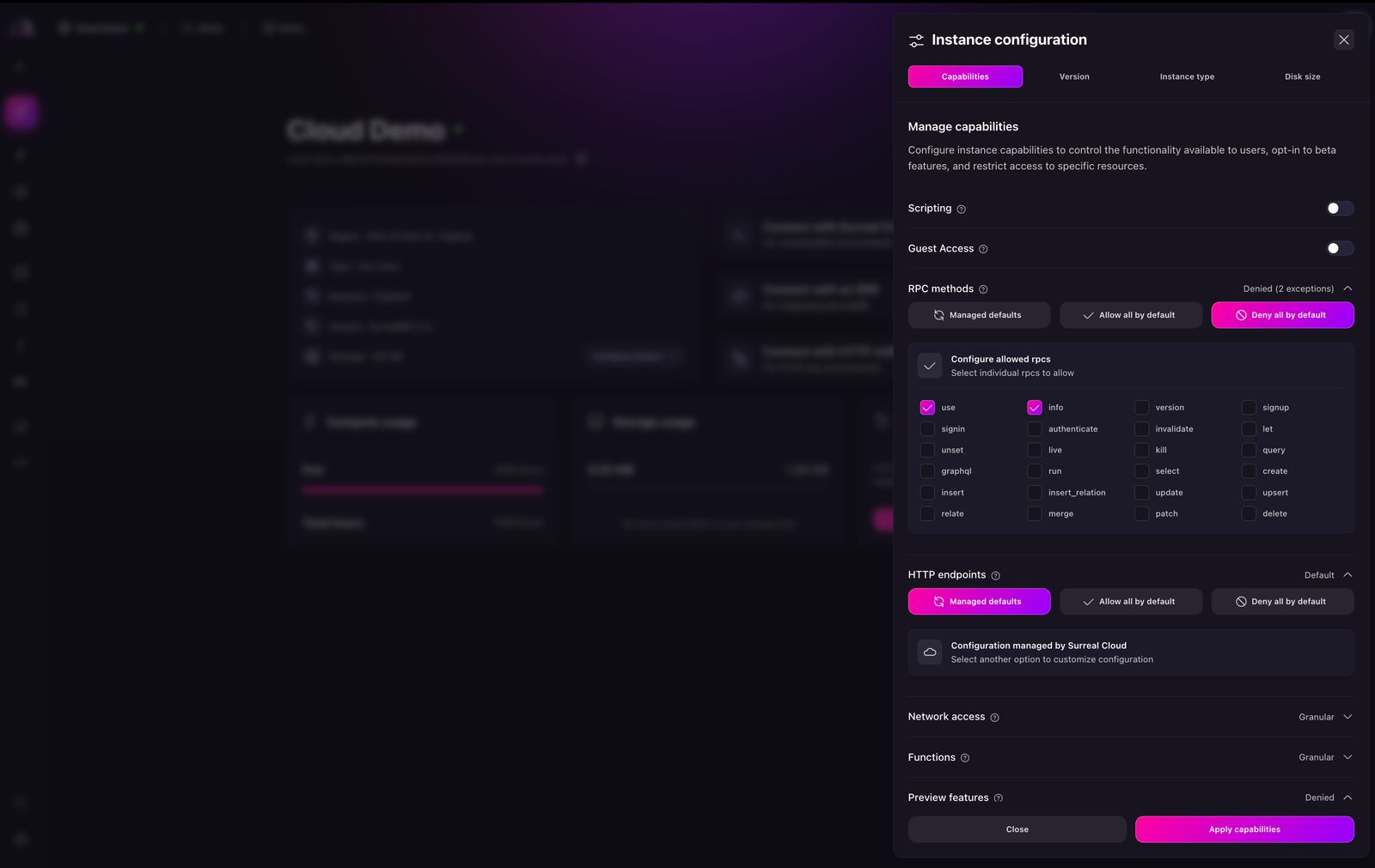 - Added the ability to customise Surreal Cloud instance capabilities