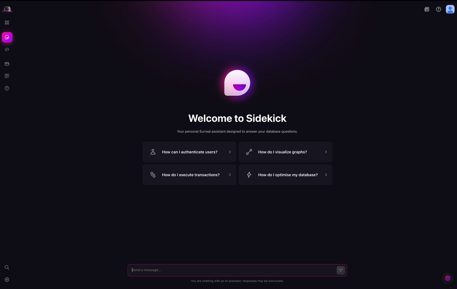 The Sidekick page has been redesigned to provide a more intuitive and user-friendly experience. The page now includes suggestion prompts to help you get started with SurrealQL. We hope you like it!