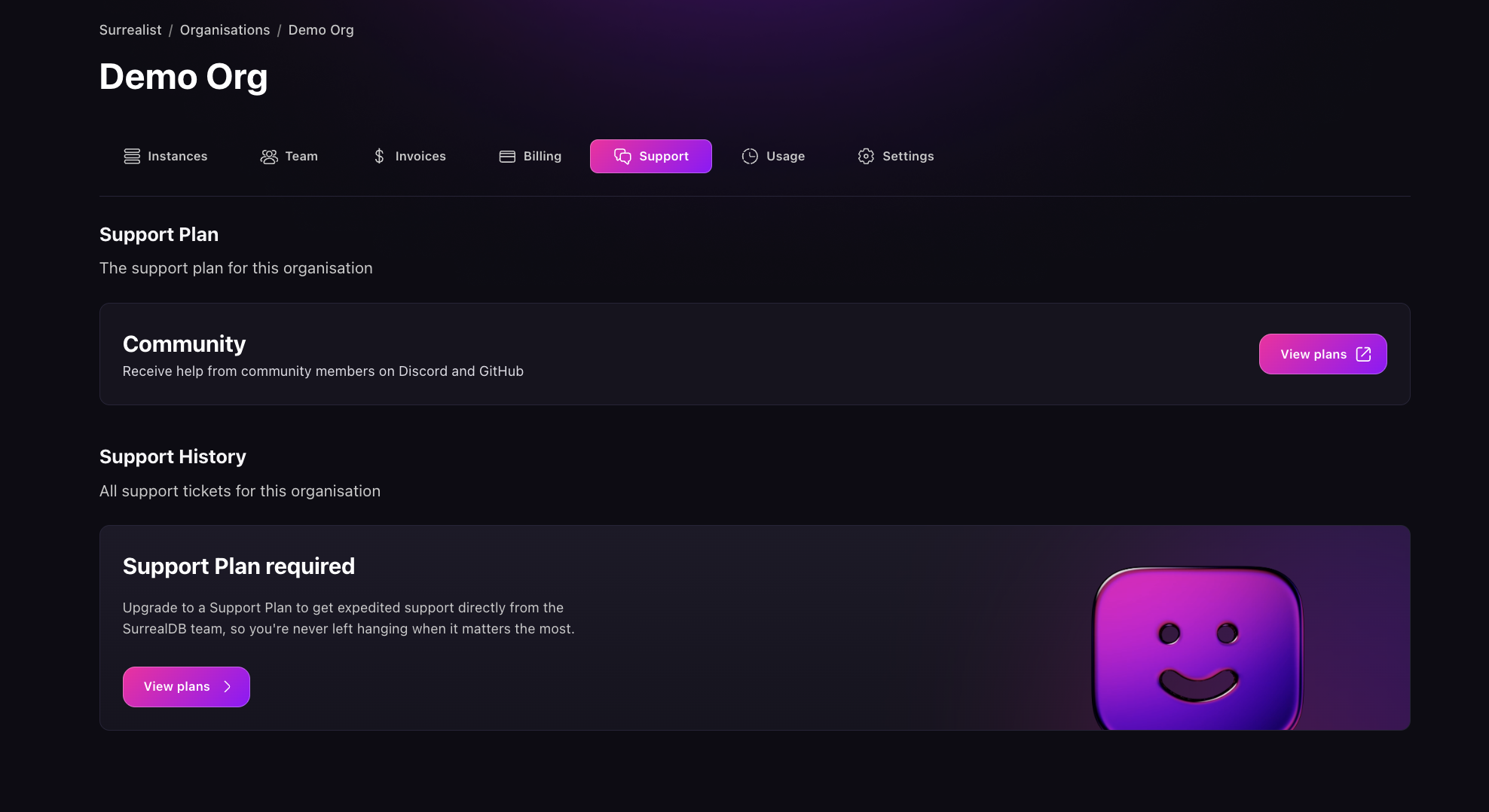 SurrealDB Cloud offers a range of support options to help you get started, enhance your skills, and resolve any issues you may encounter. You can use the free community support via our Discord server or signup for a paid support plan.