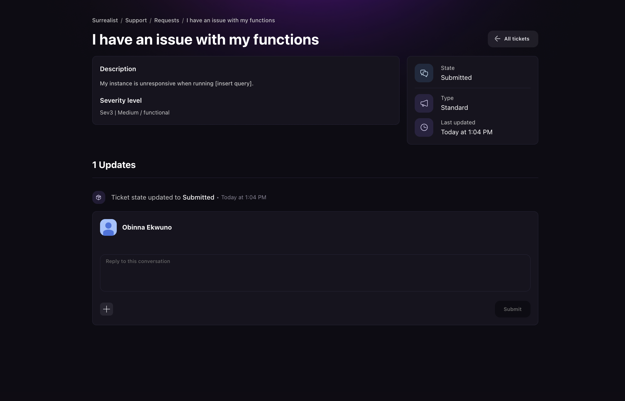 After you have added a support plan to your organisation, you can create a support ticket by clicking on the New Ticket button in the Surrealist sidebar. This will take you to the support page where you can create a new ticket.