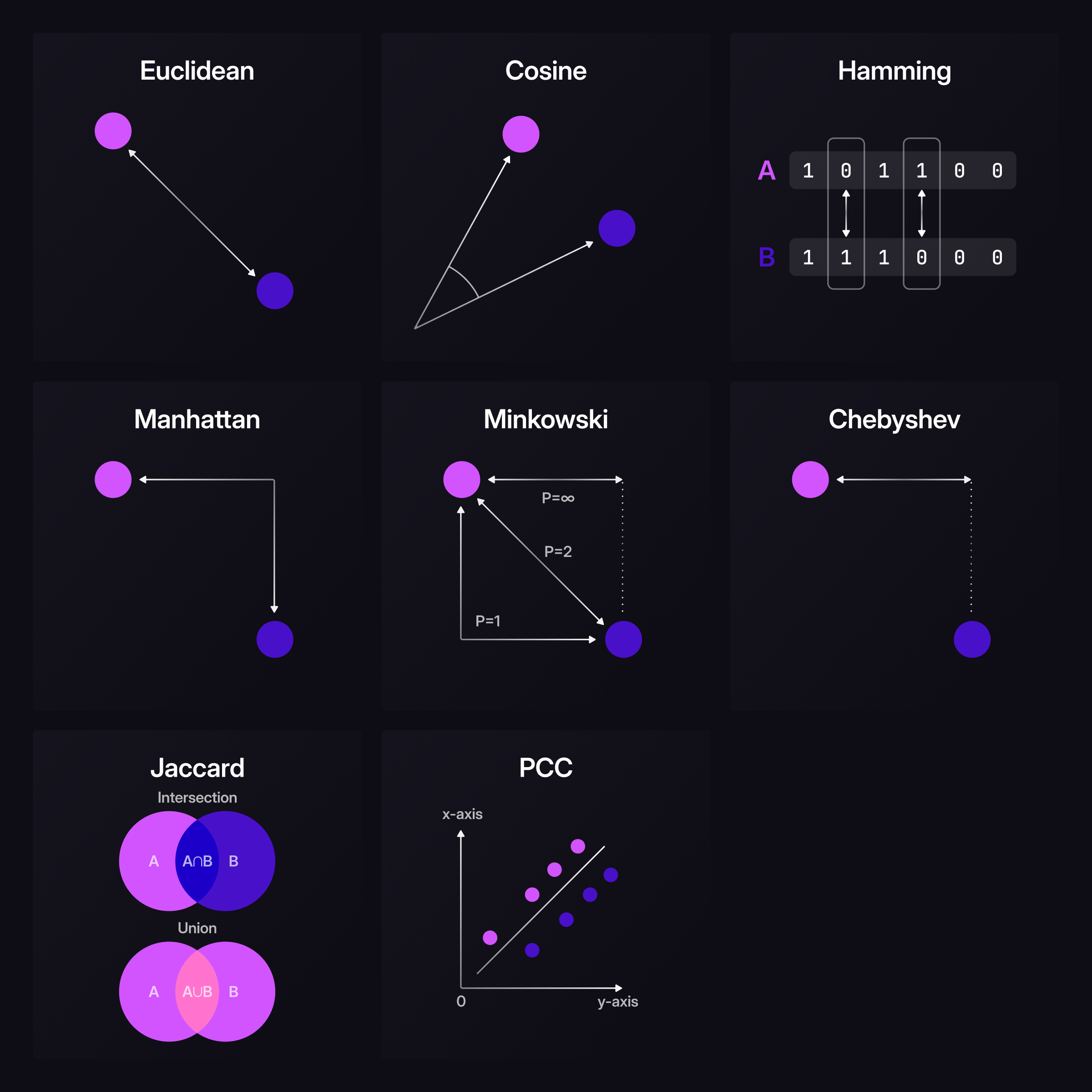 They also include similarity and distance functions, which help in understanding how similar or dissimilar two vectors are. Usually, the vector with the smallest distance or the largest cosine similarity value (closest to 1) is deemed the most similar to the item you are trying to search for.