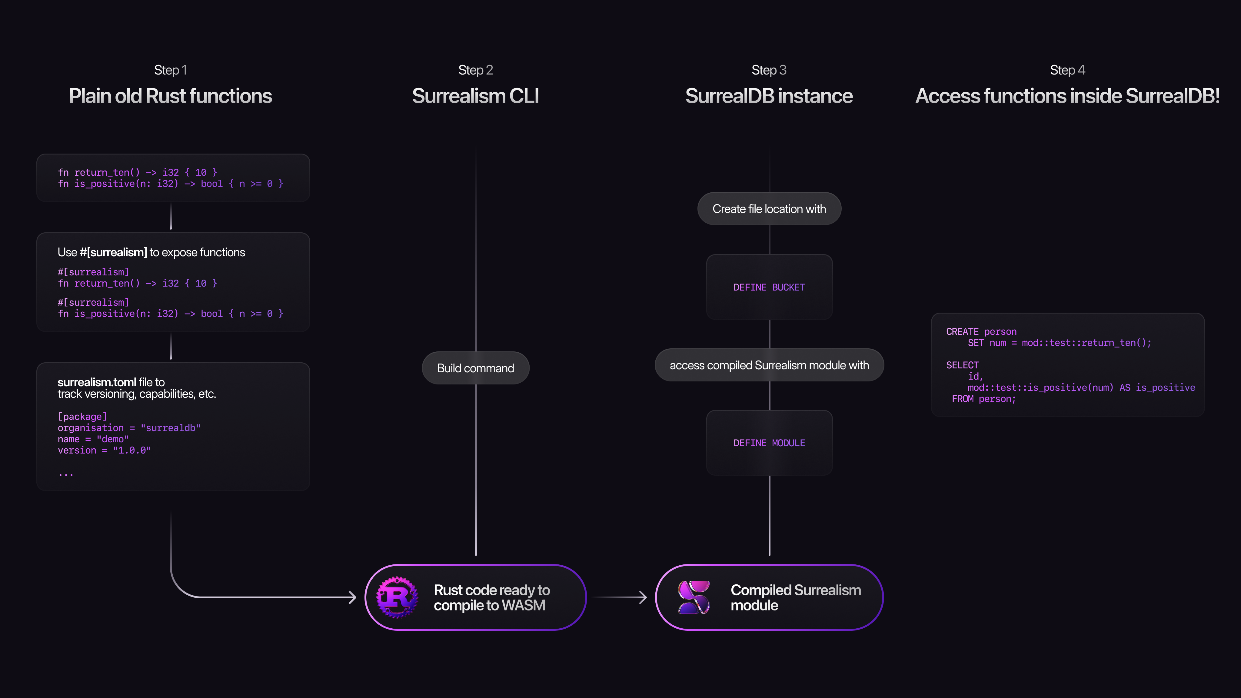 surrealism.tomlfile plus the#[surrealism]annotation over functions to expose.A CLI command compiles this code into a WASM binary.