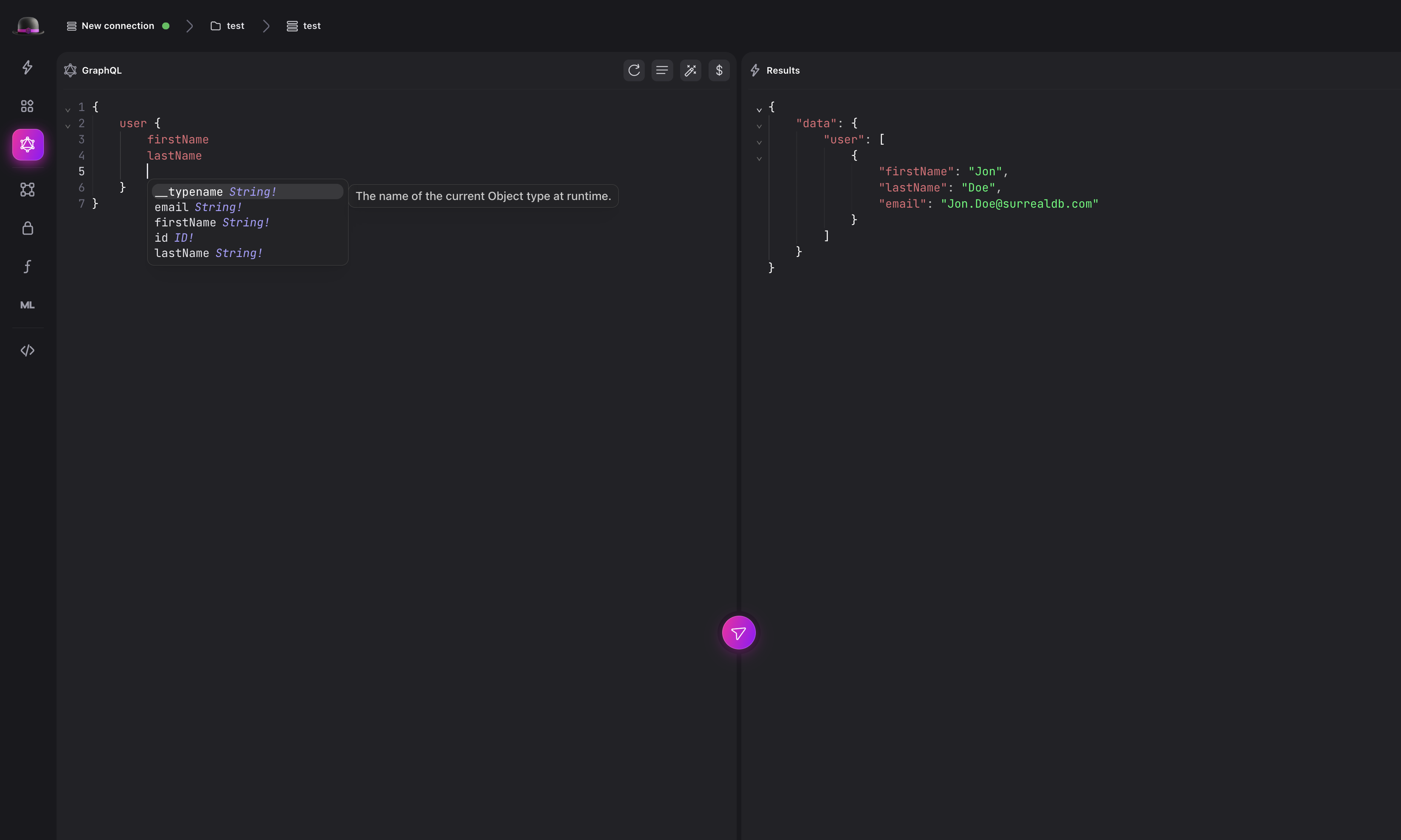 Surrealist also supports introspection with GraphQL. This means that you can query the database and Surrealist will automatically infer the type of the data you are querying. For example, if you query the user table for all records, Surrealist will automatically infer the type of the data to be user.