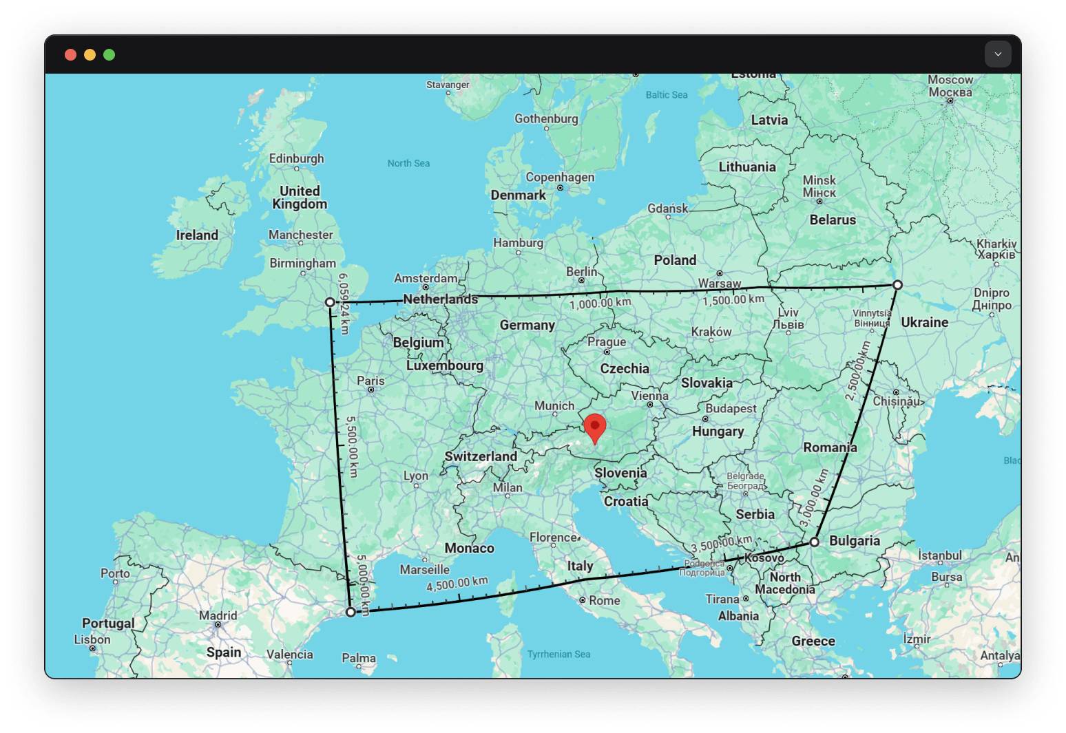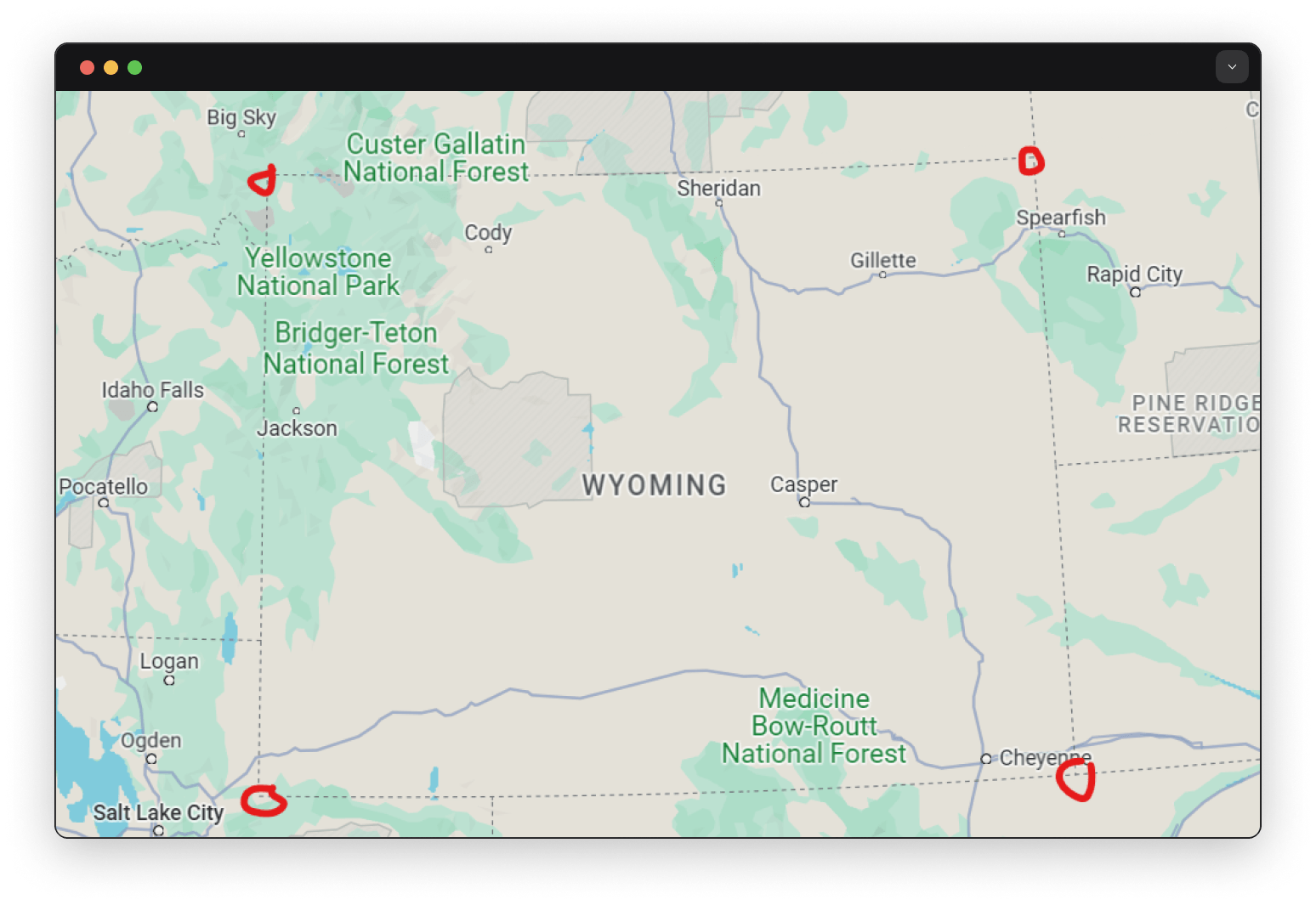 The following example shows this function, and its output, when used in a RETURN statement for four approximate points found on a map for the US state of Wyoming which has an area of 253,340 km2 and a mostly rectangular shape. Note: the doubled square brackets are because the function takes an array of an array to allow for more complex types such as MultiPolygon.