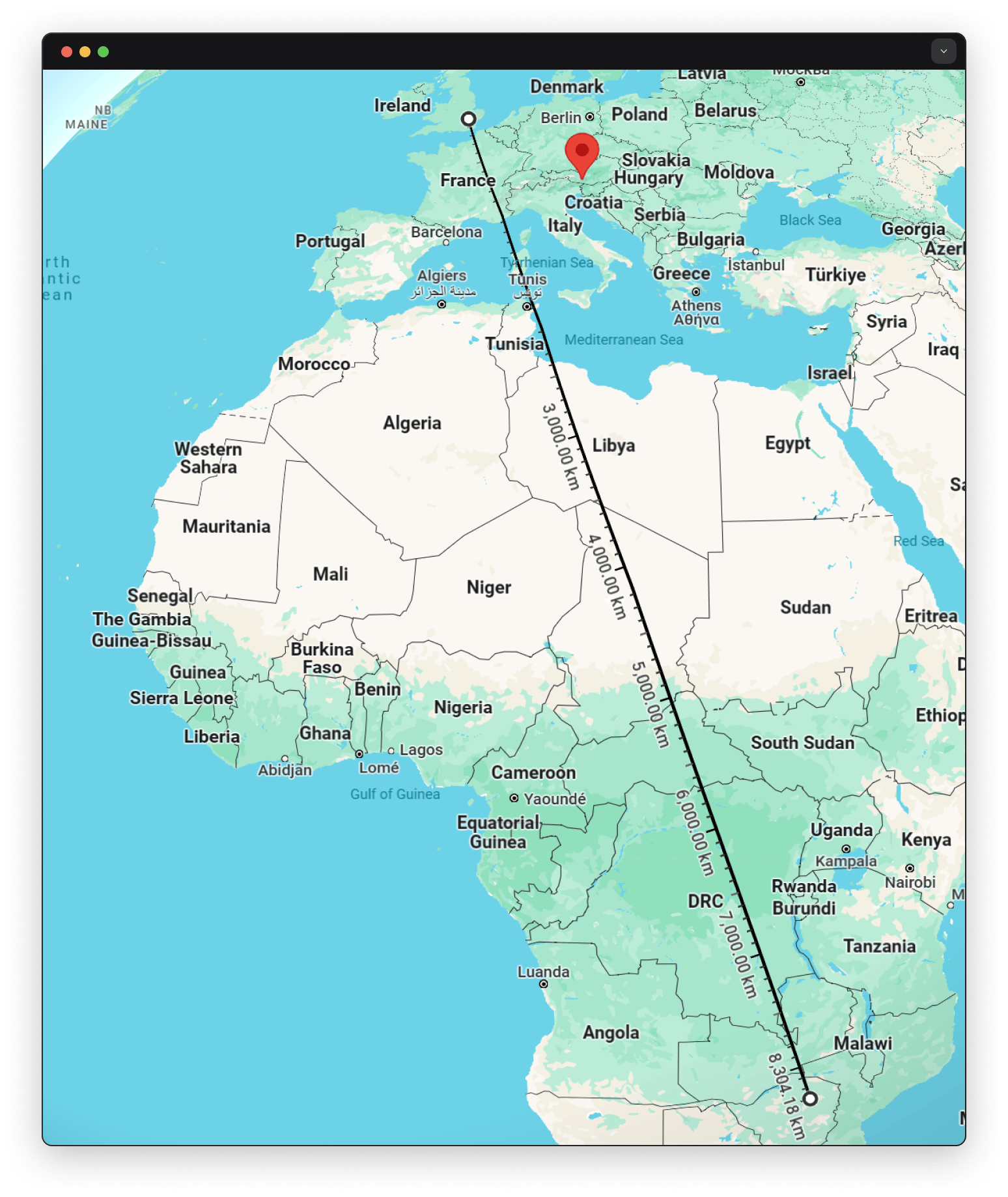 The geo::distance function calculates the haversine distance, in metres, between two geolocation points.