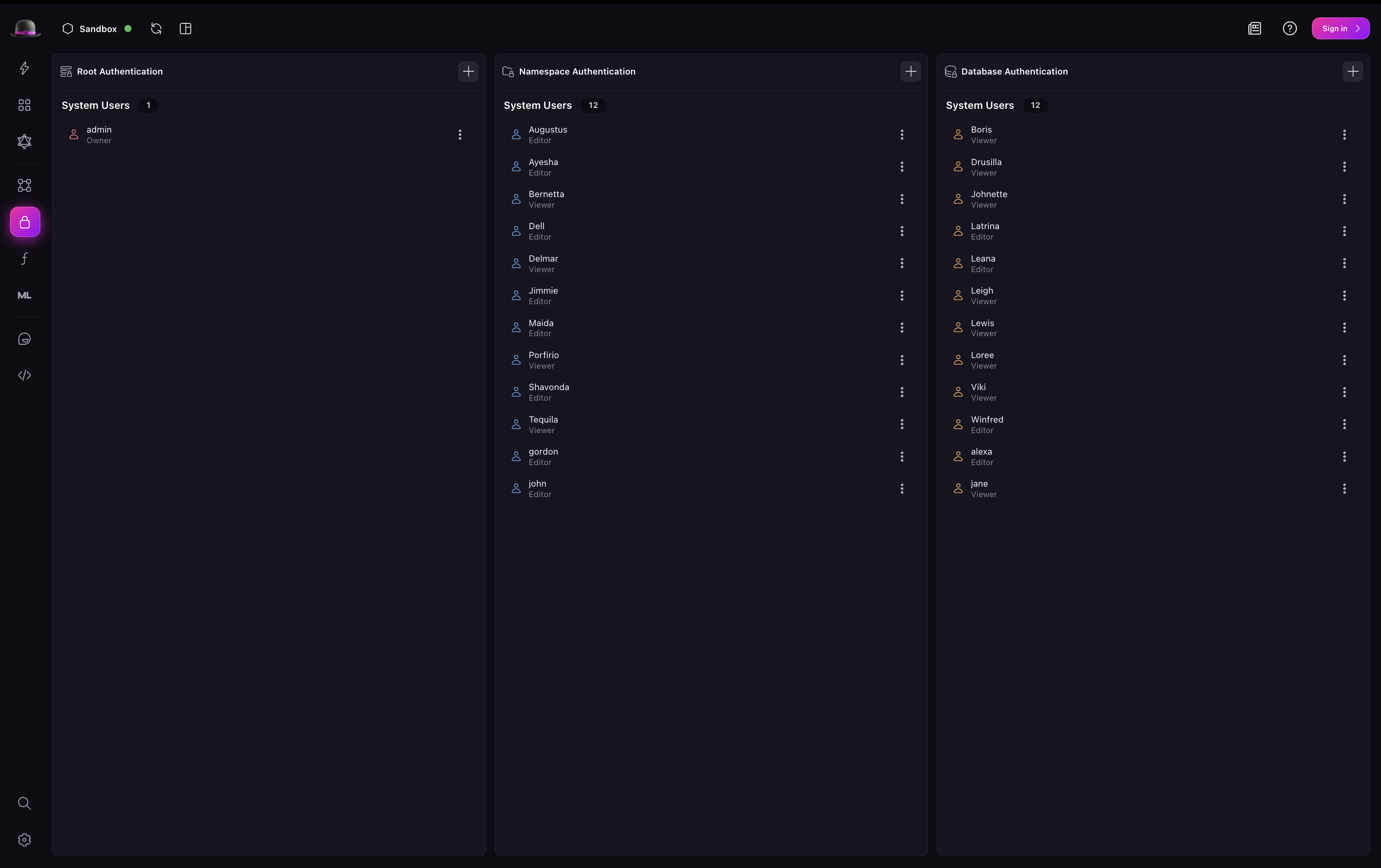 The Authentication view allows you to control account access to the database. This includes system users (root, namespace, and database) as well as scope access.