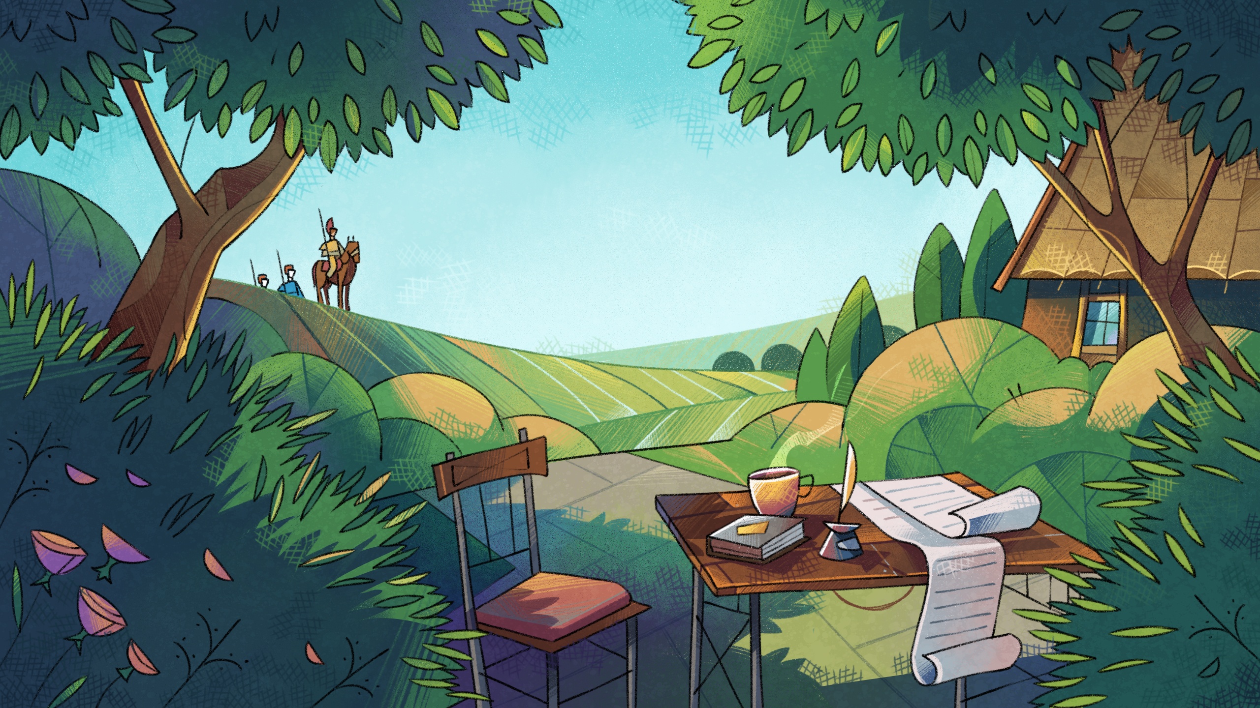 All you can see at first is a cloud of dust, but soon the riders reach the top of the nearest hill and are close enough to see. At their head is Landevin, one of the young members of the town council who is famous for being a brilliant speaker...and for his fancy name. Who gives their kid a name like Landevin, anyway?