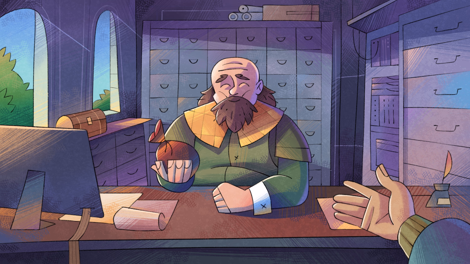 Landevin spends most of his time exploring the mainland, but has heard about the new financial system and has dropped by to see how it works.